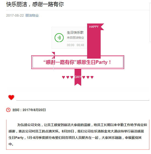 同心協(xié)力共創(chuàng)未來 ——2023麗潔橫店團(tuán)建拓展活動(dòng)圓滿結(jié)束 秋意漸濃時(shí),載譽(yù)歸來季丨麗潔服務(wù)多個(gè)小區(qū)榮獲“六好小區(qū)”榮譽(yù) 月團(tuán)圓慶華誕 麗潔與您同樂 九江潯陽區(qū)召開無物業(yè)小區(qū)清零行動(dòng)工作調(diào)度會(huì) 物業(yè)服務(wù)步入信用“軌道” 這個(gè)小區(qū)叒收到錦旗啦! 走進(jìn)物業(yè)“心臟”,感受“看不見”的服務(wù) 端午大放“粽”|你很“粽”要 抱團(tuán)打天下,逐夢(mèng)向未來|2023年麗潔服務(wù)首次素質(zhì)拓展活動(dòng) 這個(gè)春天,我們有個(gè)約會(huì)!