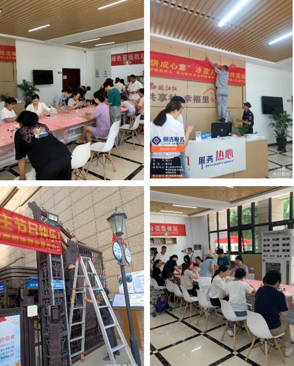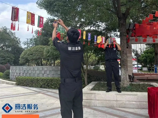 “良辰美景迎中秋 盛世華誕賀國慶”,為讓業主感受到中秋、國慶雙節的濃厚節日氛圍,麗潔服務工作人員提前在多個小區出入口、主干道等區域懸掛中秋國慶條幅及鮮紅的五星紅旗等裝飾,不僅扮靚了小區,也成為了一道靚麗的風景線,讓業主家人們感受到了濃濃的節日氣氛。